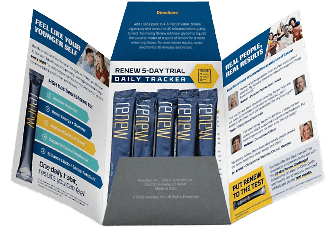 Renew is a patent-pending, scientifically tested formula that triggers your body’s natural human growth hormone (HGH) production and release to help naturally slow the cellular aging process, helping you look and feel younger.*